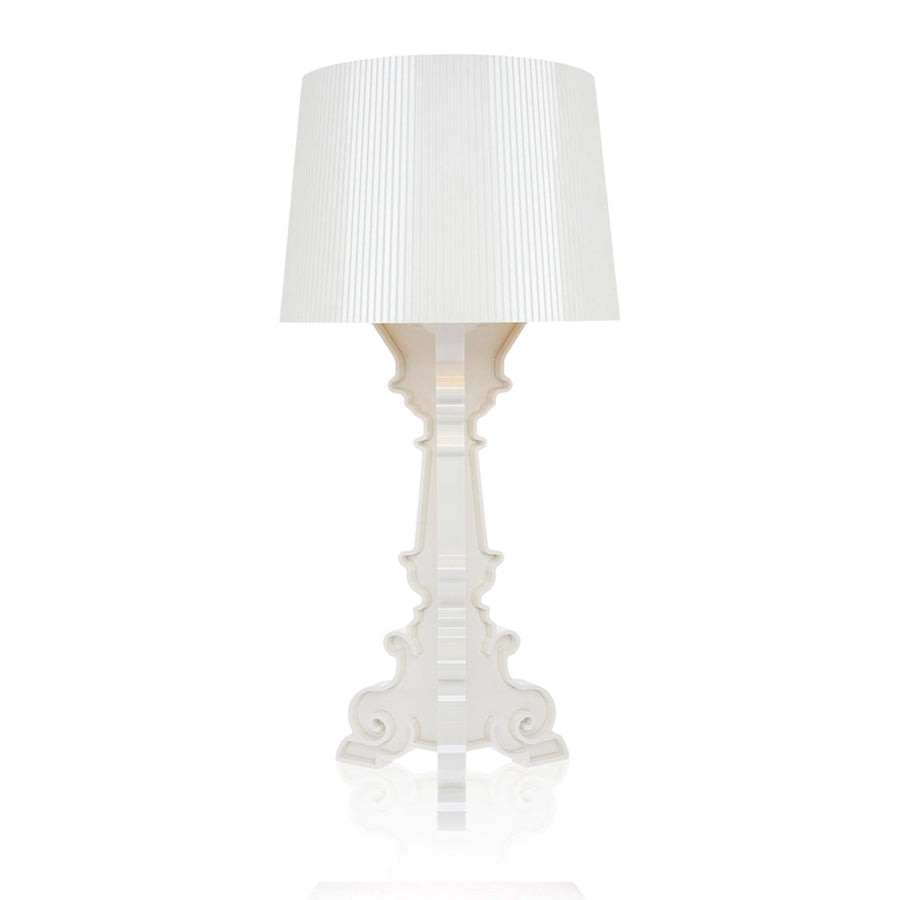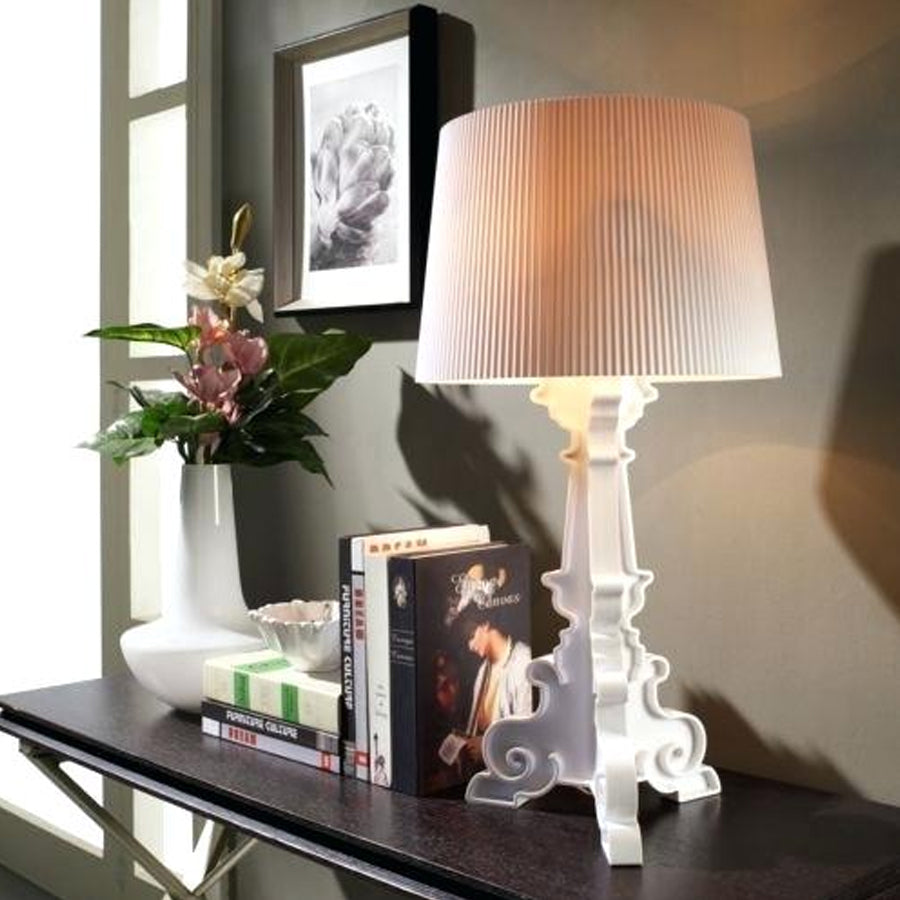 Bourgie conjuga estilo clásico, riqueza y tradición con innovación e ironía. La base, de estilo barroco, está constituida por tres patas decoradas que se cruzan, mientras que la amplia pantalla con efecto plisado crea un juego de mil reflejos cuando se enciende. Gracias al particular sistema de enganche de la pantalla se pueden obtener tres alturas diferentes, que se pueden modificar como se desee en función del uso que se le vaya a dar: 68, 73 y 78 centímetros. Diseñado por Ferruccio Laviani.