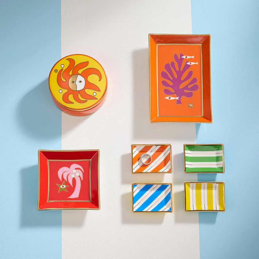 Es cierto: las rayas son para siempre y un toque de color alegre es elegante, elegante, ¡elegante! Con brillantes rayas en tonos caramelo, nuestras pequeñas bandejas Portofino iluminan tu mesita de noche, atrapan los anillos en el lavabo o le dan a cualquier mesa un toque chic: justo ese detalle que no sabías que necesitabas, pero que sin duda necesitas. Elaboradas en porcelana de alta cocción y bañadas en oro auténtico. Medidas: 8 x 6 x 1 cmDiseñador: Jonathan Adler