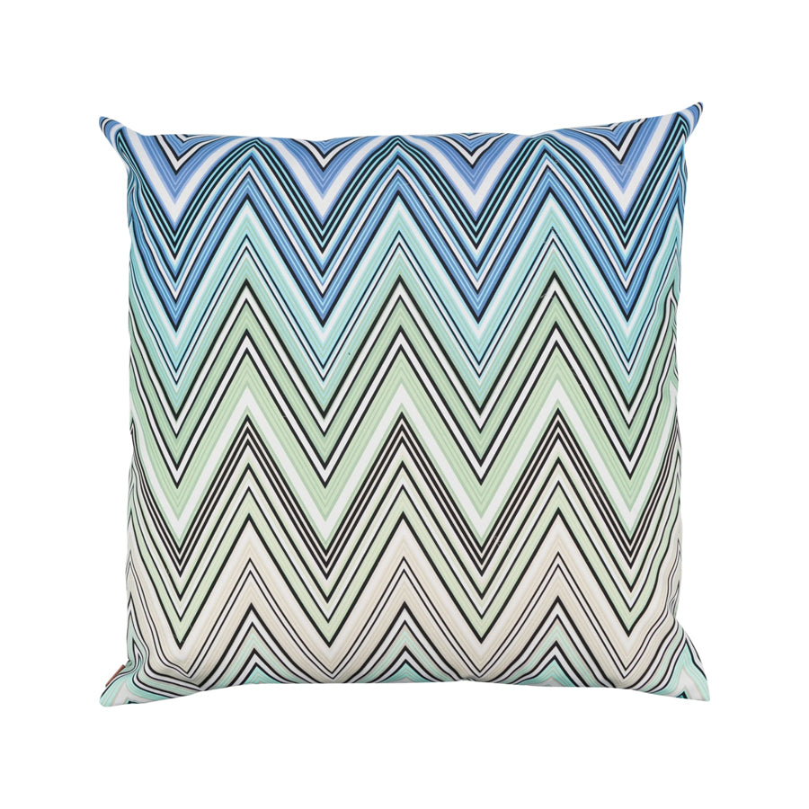 Colección Outdoor.Cojín en tejido impermeable con diseño de chevron multicolor.TEJIDO IMPERMEABLEFunda con cremallera totalmente extraíble.Hecho en Italia60 x 60 cm.
